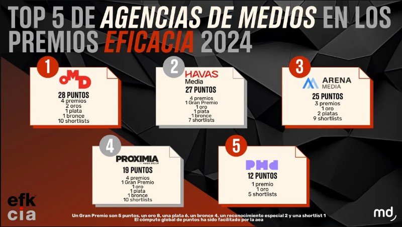 Además, Havas Media Network ha sido el grupo de esta edición que ha obtenido más Premios Eficacia en esta edición, con tres agencias en el top 5 de agencias de medios premiadas, posicionándose Havas Media en segundo lugar (27 puntos), Arena Media en tercer puesto (25 puntos) y Proximia en el cuarto (19 puntos).