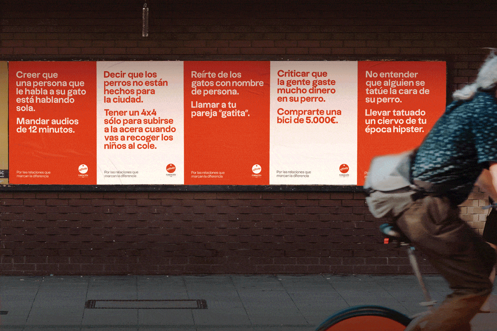 A través del ingenio y la ironía de Putos Modernos, Fundación Affinity invita a las personas a reflexionar sobre sus prejuicios y contradicciones, haciendo un guiño a los pet parents y posicionándose como sus defensores con mensajes ácidos como: Crees que una persona que le habla a su gato está hablando sola. Mandar audios de 12 minutos, Decir que los perros no están hechos para la ciudad. Tener un 4×4 sólo para subirte a la acera cuando vas a recoger a los niños al cole o Reírte de los gatos con nombre de persona. Llamar a tu pareja «gatita»…
