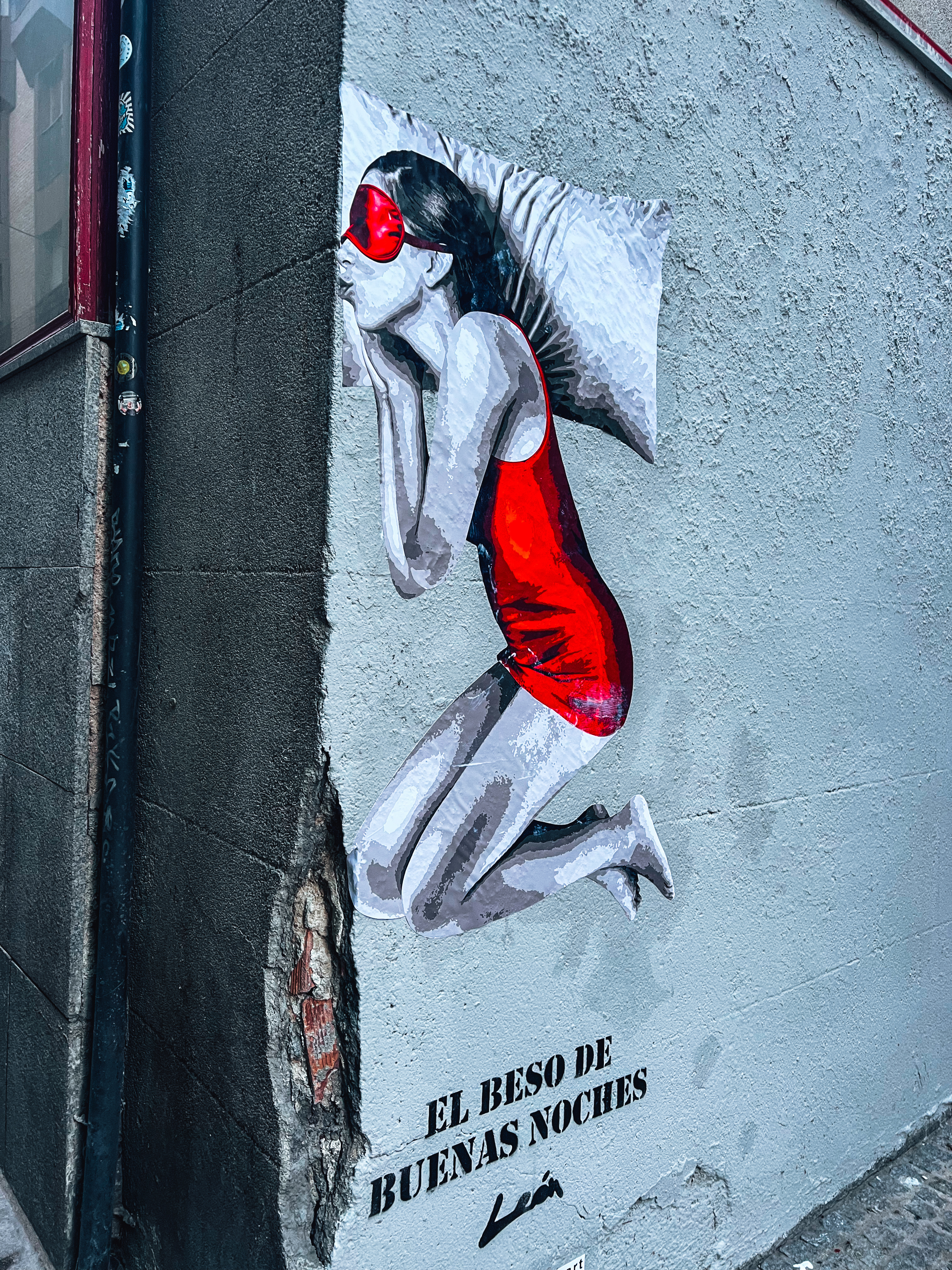 Pikolin reivindica el beso de buenas noches con un grafiti en el corazón de Madrid